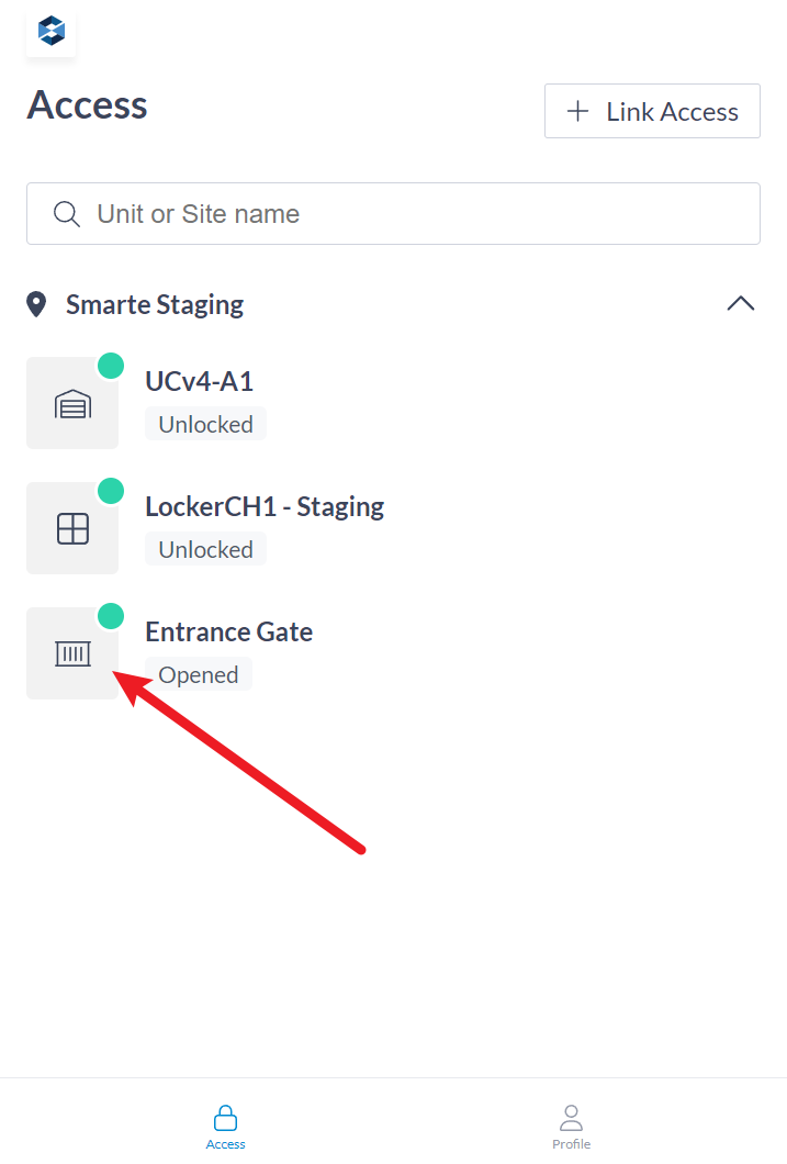 - Listed will be the storage unit(s) and/or the gate(s) that the customer can operate using the app.