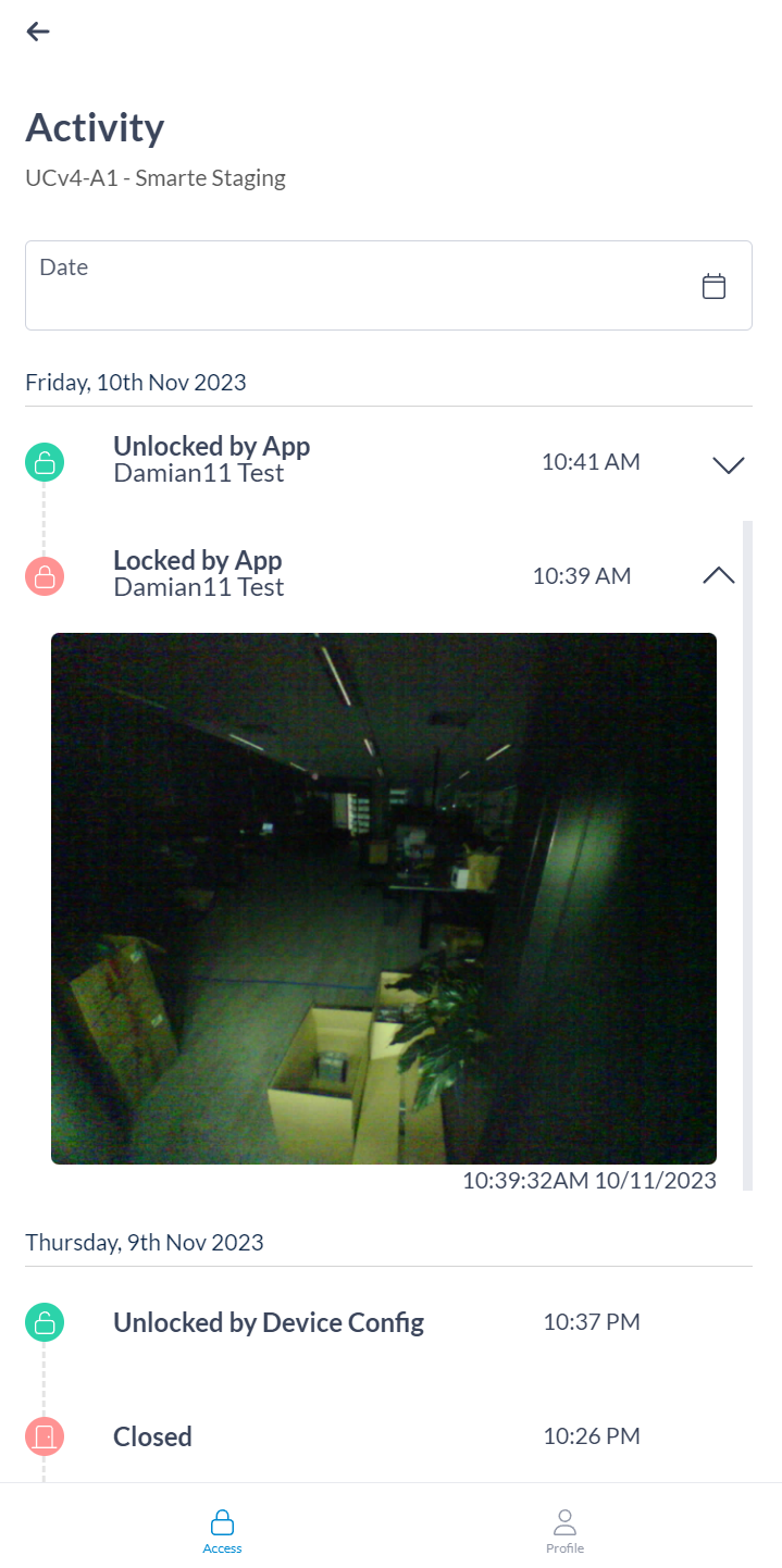 The Activity log lists all the door operations of the storage unit. It includes who opened and closed the door, dates, times and snapshot images taken when the door opens and closes. It also lists alarm notifications.