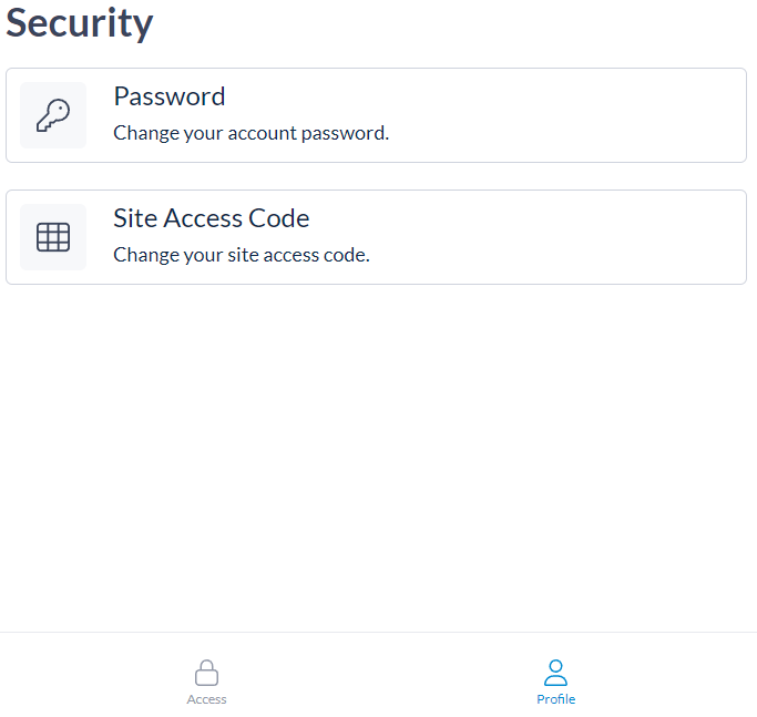 This section allows a customer to update/change their password and set or change their Site Access Code.