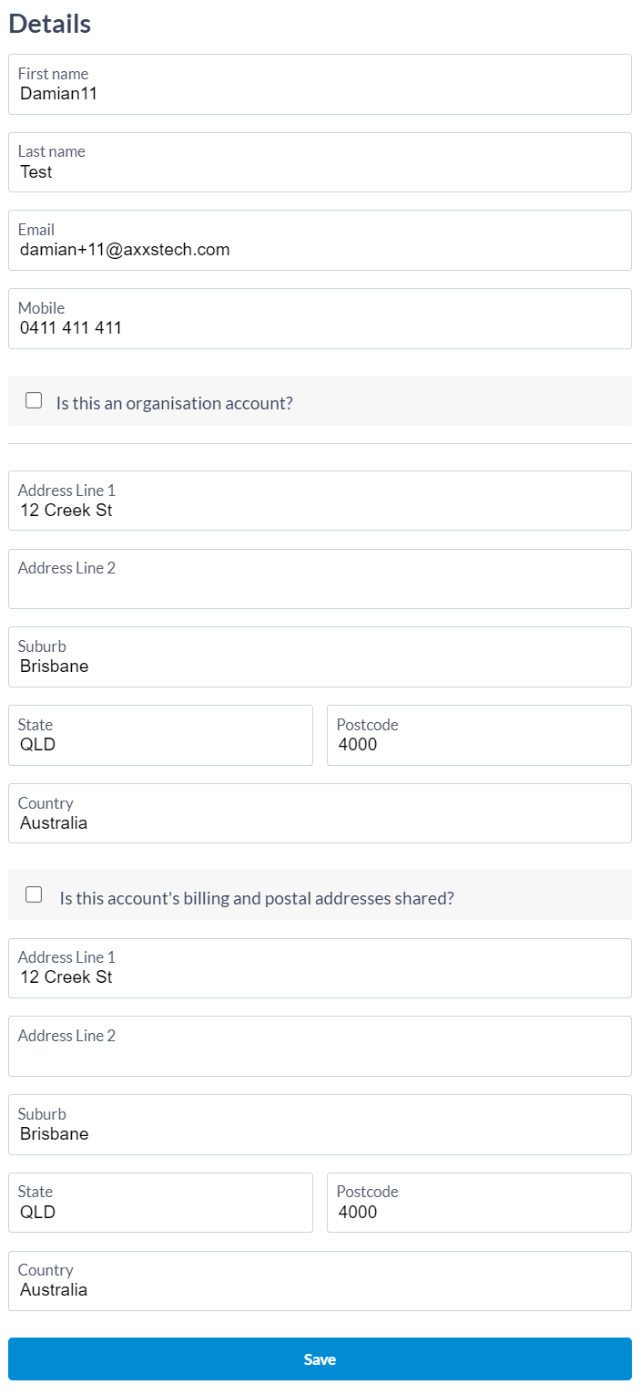 This section allows a customer to edit/update their name, email, mobile phone number, postal address and billing address.